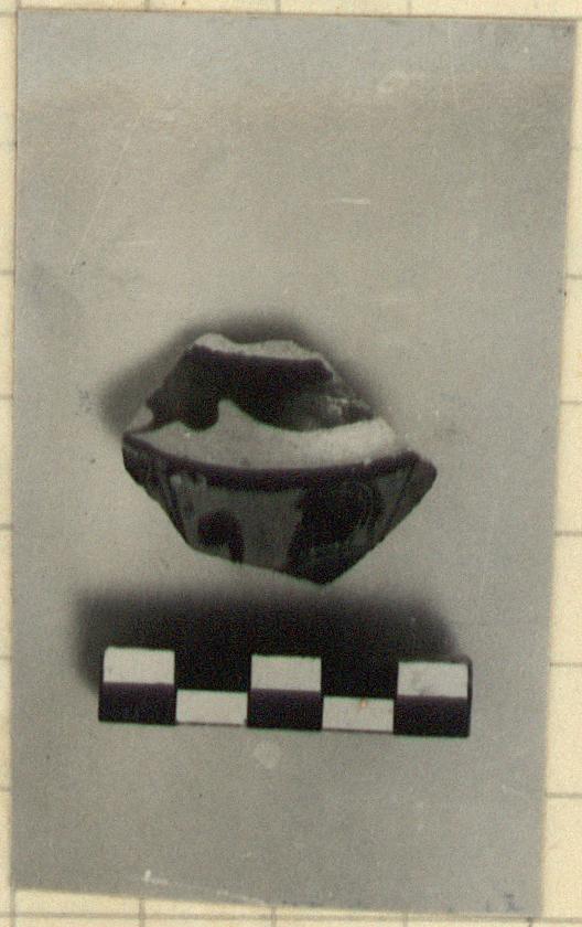 | Description: | From an early lekythos. Two non-joining fragments. (Possibly not from the the same pot.) a) Man in short skirt running right, looking back; in front of him, the shield and leg of another warrior. b) From shoulder: head and shield of a warrior left, helmeted. Purple red retouches, hasty incisions. | |