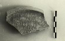 | Description: | From a shallow flat-bottomed saucer with furrowed rim, glazed red. The bottom left rough from the wheel. Incised inside: <graphic> Cf. Hesperia Suppl. 4 (1940), p. 135. | |