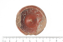 | Description: | Base of a small Pergamene bowl covered with red glaze. Scratched around the bottom: Ν Ι Κ Ο Λ Α Ο Υ Inside the glaze has peeled; scratched in the center: Ν Fine buff clay; good red glaze. | |