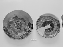 | Description: | More than half preserved. High ring foot. Rosettes around the rim outlined in dark blue or black and set in a brighter blue background. The centers of the flowers below the rim are green, the petals a dark blue, In the central portion the leaves are green, the flowers blue. The exterior was plain white with small scattered ornaments; preserved are two: a circle in blue and an uncertain object in blue(?) and green. The paint in the petals is, in places, so thick that it gives the effect of relief. Coarse gray clay with a rather thick white slip, badly discolored. Originally the glaze may have been white. ADDENDA Late Iznik or imitation. Late 17th.-early 18th. c. Cf. P 26504-P 26505 (JWH). | |