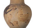 | Description: | Lip, most of neck, handle, foot and large portions of body missing; restored in plaster. On neck, horizontal stripes; above base, spiral hooks. Broad figured zone with triple ground-line: two lions walking towards each other, a front paw raised. Filling ornament: groups of zigzags; diamond; vegetal ornament. Heads, teeth and tongue, paws, drawn in outline; muzzles stippled. Pinkish buff clay, dull black to brown glaze, much peeled. Restoration includes P 5284 (Β 1431). Additional fragments found later in section Ζ (Ζ 1661): a) Hind foot of left hand lion; diamond filler behind it; three lines and the tip of a spiral ray below. b) Parts of three spiral rays and of three lines above; from back. c) Parts of two spiral rays and of three lines above; from front. | |