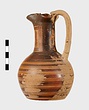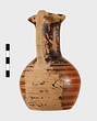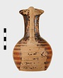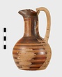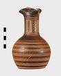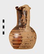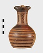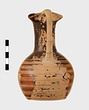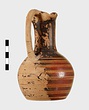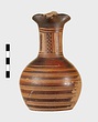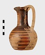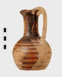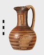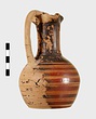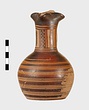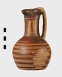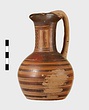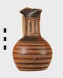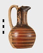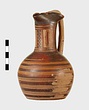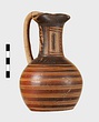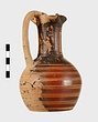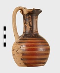 | Description: | Flat-bottomed oinochoe with rounded body, long narrow neck, trefoil lip and one vertical loop handle. Body decorated to shoulder with alternating glaze bands; one wide, two narrow. Shoulder black. Reserved metope on front of neck; bordered by two narrow glazed bands all the way round. Center of neck, checkerboard pattern flanked each side by vertical lines surrounded by dots. Rest of neck and lip, black. Handle reserved. Slipped; somewhat metallic black-to-reddish glaze, partially peeled. | |