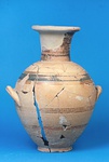 Description:   Ring foot, ovoid body, rather narrow slightly concave neck and heavily rounded flaring lip. One vertical strap handle, shoulder to lip; two horizontal uptilted loop handles on body. Body decorated with narrow bands in series of two and three; wide band at shoulder. Neck glazed black. Below base of neck, series of diagonal fringes and an arrow pointing downward at the center. On vertical handle, framed, a St. Andrew's cross.