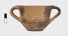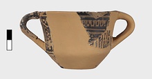 | Description: | From a cup similar to P 4986 (Β 1330), but deeper bodied and without a stand. Restored in plaster with a second handle. Flat bottom; inside, bands and interlocking hanging and standing vertical strokes. Outside, bands to lower handle attachment; on body, maeander between vertical zigzags. On resting surface, rings. | |