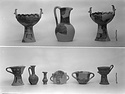 | Description: | Mended from many pieces; about a half of the cup and the start of the stand preserved. A large rim fragment, a bit of a snake, and a second bird do not join. Fragment b) is a non-joing fragment of the stand. Restored in plaster with additional fragments of the foot. Shallow bowl on perforated stand; one vertical ring handle preserved, with bird perched on top looking into cup. Around outside of lip, a plastic snake. Inside glazed black; series of strokes on lip. Outside, horizontal and vertical zigzags separated by bands. Buff clay; dull black glaze. | |
