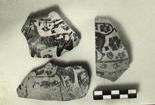 | Description: | From a round-bodied amphora with straight neck, decorated with animal bands: a) Part of base of neck; on shoulder, lion walking left. b) Lion walking right; wing of bird in front of him. c) Above, rear end of lion, left; in lower frieze, back of another animal (lion?). added purple red for lions' manes, etc.; incised rosettes in field. Attic clay, buff slip. | |