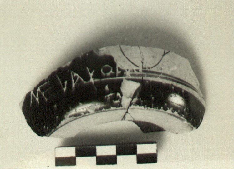 | Description: | From an open pot, with false ring foot and red figured decoration. A broad moulded band, just inside the resting surface, reserved. Thick glaze, shiny outside, duller inside. No relief contours. Incised outside: <graphic> | |