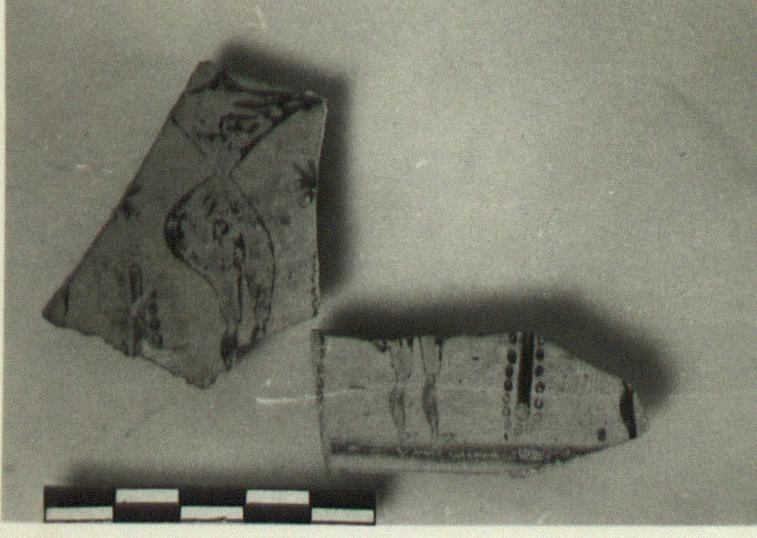 | Description: | Many fragments added from containers and mended together with plaster. Depicts zone of mourners to r., with their arms up, tearing their hair. Between each, a star and a long vertical blob surrounded by dots. Above, a zone of latticed triangles, and farther up, a complicated maeander, hatched. Below, a dotted lozenge chain; verticals extend upward and downward from the apices of the lozenges. Further down, part of another maeander. Clay pink to grayish, with a finely smoothed gray-buff surface, dull black glaze. | |