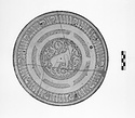 | Description: | Shallow plate on high ring foot. Mended from five pieces, a small bit missing from the edge. Three pairs of rivet holes indicate an ancient mend. Fine sgraffito decoration. Nicked edge; then two bands of conventional pattern. In the central medallion, against a background of tendrils, an animal (lion?) right, head turned back. Red clay, covered with white slip, and glazed all over; the glaze pale greenish on the top, colorless on the underside. | |