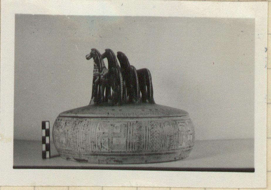 | Handling: | Object should be protected from vibration and impact. It should be placed on a padded surface for display. Lid: object should not be picked up by the horses which pose as a handle. Object should rest on padded surface for display and not on the pyxis base. | |
