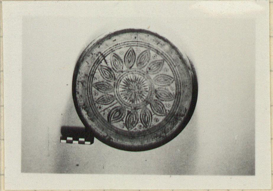 | Description: | The lid complete; one horse broken off but repaired; the body intact. a) Pyxis: Low pseudo-ring foot, convex side-wall, lip flanged inside; flange and lid pierced for tying. Wide band around bottom; between two narrow bands a broad zone; in panels, hatched swastikas with dot rosettes between their arms. Between panels, parallel horizontal zigzags bordered by vertical lines on each side. On bottom: center, many-rayed star; around it, a ring of concentric lozenge-shaped leaves with dot rosettes between their tips; between three bands inside and out. Around edge wide band. b) Lid: Shallow convex lid with three-horse handle. Around edge: diagonal strokes, three bands, row of linked dots, three bands, diagonal strokes. Horses glazed black; bands on reserved manes and tails, linked dots between bands across reserved chests, St. Andrew's crosses on faces. Creamy slip; dull black and brown glaze, much peeled. | |
