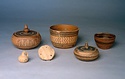 | Description: | Round-bodied, flat-bottomed handmade pot with narrow neck, flaring lip and one vertical strap handle lip to shoulder. On shoulder at handle attachment zone, incised, two horizontal lines, dotted on each side. Micaceous pale buff clay, unglazed. | |