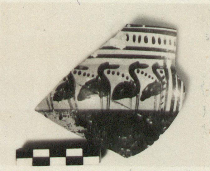 | Description: | Cup with deep convex body and high straight lip. On lip, dots between bands. In handle band, long-necked water birds in procession to the right; rows of dots in field. Inside glazed black; reserved band at lip. | |