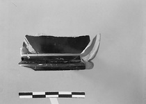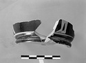| Description: | Part of base with ring foot and of lower wall remains. On a reserved line the feet of two athletes, one stationary, to left, the other to right, only his toes touching the ground. Relief contours. Glossy black glaze inside and out. The resting surface and the bottom inside the foot reserved, with central glazed circle and dot. | |