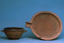 | Description: | One handle, fragments of wall and middle of floor missing; restored in plaster. Sharply profiled base ring; downturned lip. Reddish brown glaze on inside and on a band below level of handles and on base. | |