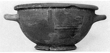 | Description: | One handle, fragments of wall and middle of floor missing; restored in plaster. Sharply profiled base ring; downturned lip. Reddish brown glaze on inside and on a band below level of handles and on base. | |