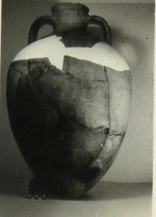 | Description: | Tip and fragments from wall missing, the wall restored in plaster. Similar in shape and fabric to P 5176 (Α 1098) ff. Clay yellow. A reddish brown band near the bottom. In brown paint on shoulder: <graphic> ADDENDA P 5176: Short neck; thickened at lip; small handles. | |