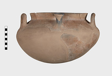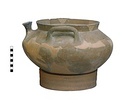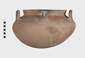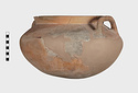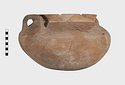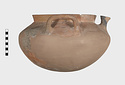 | Description: | Much of the wall missing; restored in plaster. Round bottom; two vertical handles; tubular spout rising from the shoulder; ledge for lid. Gritty micaceous brown clay; blackened by fire. | |