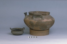 | Description: | One handle and much of the wall missing; restored in plaster. Flat bowl rounded below; ledge for lid surrounded by high rim, from top of which rise the vertical handles. Gritty brown clay, blackened by fire. On base, graffito: <graphic> | |