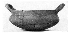 | Description: | One handle and much of the wall missing; restored in plaster. Flat bowl rounded below; ledge for lid surrounded by high rim, from top of which rise the vertical handles. Gritty brown clay, blackened by fire. On base, graffito: <graphic> | |