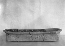 Description:   Most of the floor and much of the wall missing; restored in plaster. Flat bottom; straight sides; rounded ends. Rim flat on top and projecting outside.
