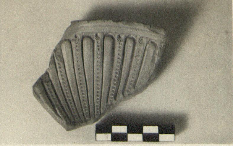 | Description: | Part of the original top of mold is preserved; broken elsewhere. The outside has two incised lines below the rim. Long petals separated by jewelled lines terminating in tiny fronds. For a bowl such as P 596. | |