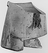Description:   Broken top and bottom, and much damaged by burning; the glaze much peeled. Two panels, separated by vertical stripes, one beneath each ear, of maeander alternating with saltire cross.