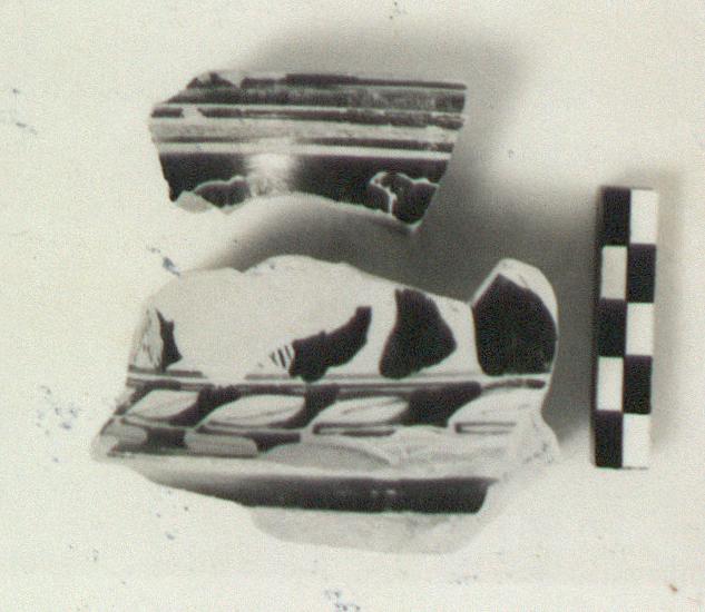 Description:   a) From the bottom: tripartite foot, projecting keel around bottom of body, with olive wreath. Above, feet and legs of man, facing left, across an undistinguishable object, a draped woman(?).