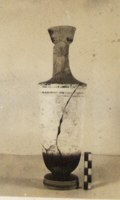 | Description: | Mended from many pieces; decoration very like P 5272, save that the foot is here concave-convex, and the upper, concave part reserved. A semi-draped youth is seated to the left of a pedimental grave stele, holding a box in his left hand. Traces of red bands on the stele and on the youth's drapery. Gray matte paint. | |