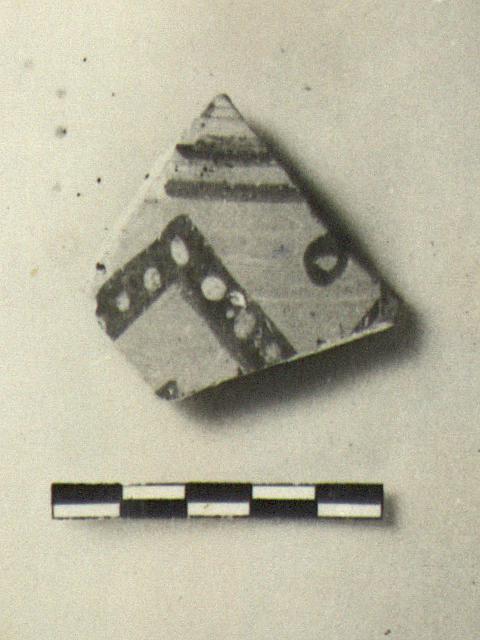 | Description: | From a closed pot. Zigzag in red glaze, dotted with spots in added white, in field, circles and lozenges. | |