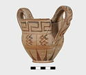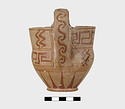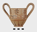 | Description: | One handle broken, but repaired. Very small chip missing from rim near handle. Low ring base. Ray pattern around the base; above this, two decorated bands: double vertical zigzags and maeander (the patterns reversed on opposite sides of cup); on handles, interlocking spirals. Clay buff. Dull glaze, reddish-brown to black; inside glazed. For motifs, cf. Pfuhl (1923) I, p. 71. S-pattern more frequent in Boeotia than in Attica. Shape and pattern show close relations with Geometric. Early Orientalizing style. | |