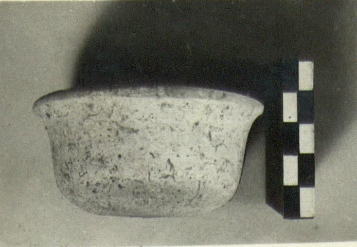 | Description: | Small cup with rounded bottom and outward-flaring lip; one vertical strap handle, broken off(?). Gray clay, greenish cream slip. Not glazed or decorated in any way whatsoever. Heavy fabric. (Non-Attic?) | |