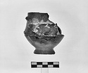 | Description: | Both handles and part of wall missing. In handle band, laurel sprays in added thinned clay paint. Traces of white on stem. Glaze much peeled; red on foot. Similar to P 5349 (Β' 583). | |