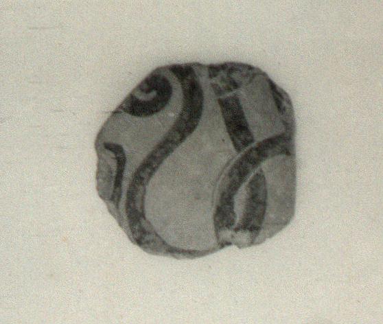 | Description: | Protoattic sherd used as counter. Nearly flat; roughly polygonal in outline. Part of a naturalistic design in spiral coils: octopus(?) or hydra(?) or floral design(?). Incised where the coils overlap. Pinkish-buff clay. Buff slip. Dull black paint. | |