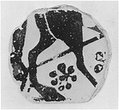 | Description: | Nearly circular fragment from plaque; a bit of the lower edge of the plaque preserved. Hind legs of animal with dot rosettes. Accessory purple; incised line between haunches. Pale pinkish-buff clay. Faintly lustrous black paint. ADDENDA Part of a chariot, wheel and pole. Resembles closely Corinthian or Black Figure plaques found elsewhere (cf. Melian vase, Pfuhl (1923), fig. 110). Cf. New York Nessos amphora for the drawing of the feet. Dated in the 3rd quarter of the 7th c. B.C. | |