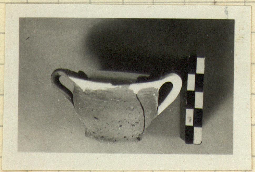 | Description: | One handle and parts of rim restored in plaster. Similar to P 5396 (Β' 656); the handles lower. Unglazed. | |