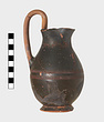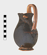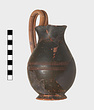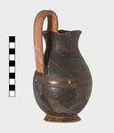 | Description: | Mended from many pieces; the base complete; large portions of body, trefoil lip and handle restored in plaster. Heavy flaring foot reserved underneath; double handle reserved. Metallic black glaze outside and inside on lip. Red bands: two around point of greatest circumference and a wavy one around the neck. | |