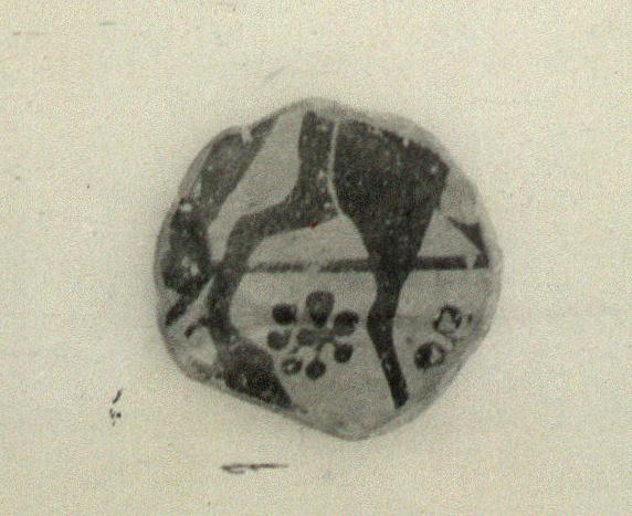 | Description: | Nearly circular fragment from plaque; a bit of the lower edge of the plaque preserved. Hind legs of animal with dot rosettes. Accessory purple; incised line between haunches. Pale pinkish-buff clay. Faintly lustrous black paint. ADDENDA Part of a chariot, wheel and pole. Resembles closely Corinthian or Black Figure plaques found elsewhere (cf. Melian vase, Pfuhl (1923), fig. 110). Cf. New York Nessos amphora for the drawing of the feet. Dated in the 3rd quarter of the 7th c. B.C. | |