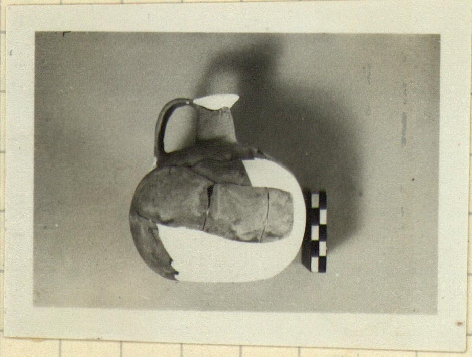 | Description: | Squat jug. Mended from many pieces and restored in plaster. Globular body, flat bottom, narrow, slightly bulging neck, band handle, flaring lip to shoulder. Marks of paring appear clearly on shoulder. Fine buff clay, stout fabric. Handmade. | |