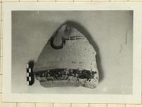 | Description: | Flat bottom, wall sloping outward, pierced ca. 0.045 m. above the bottom by a large hole, width preserved 0.045 m. Coarse pinkish-buff clay, slipped; black glaze on the inside of the hole, for a broad band around the bottom, and for decoration of narrow bands and large loop above. | |