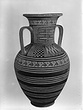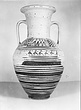 Body, from bottom to point of greatest circumference, covered with glazed bands, one wide and three narrow, alternating. At base of shoulder, band of long-necked, long-legged birds with hatched bodies, left. Between each bird, two dots. Below base of neck, on each side, three panels separated by vertical lines: outer panels filled with checkerboard; central panels with horizontal reserved zigzag, the triangles above and below cross-hatched. Neck panels front and back filled with hatched complicated maeanders; above, zone of birds left, two dots between each, above upper handle attachments. On outer face of lip, row of dots. Horizontal bands on handles.
