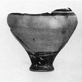| Description: | Two contiguous fragments, preserving the small projecting vase and part of the body of a vase similar in shape to P 4646. Fine buff clay; creamy slip. Around the bottom and the base, a broad band of thin orange-red glaze. On the shoulder two bands, red to black, and slanting lines above them. | |