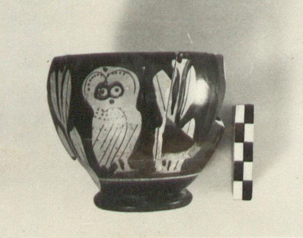| Description: | Glaux cup. About two-thirds of the rim and most of one side missing; a trace of the start of a horizontal handle remains. Heavy ring foot; rather thick fabric. On each side, an owl right, head facing, between olive branches. No contours. The glaze streaky. | |