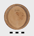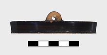 Description:   Flat circular lid with downward rim to fit over pyxis. Small vertical handle at center of top. Glazed black, except interior and handle.