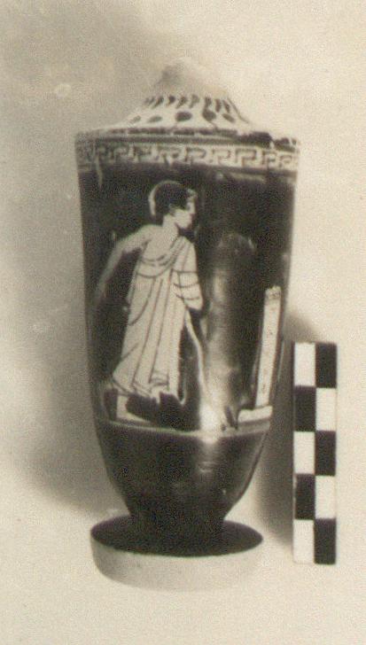 | Description: | Handle and neck missing. On front, draped youth right, leaning on his staff. To each side of him a stele, on which is written in black letters running vertically, ΚΑΛΟΣ. Shoulder reserved with two rows of buds; simple maeander at top of wall. Side and under surface of foot reserved. Relief contours for the boy's head and arm, careless. | |