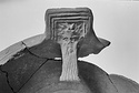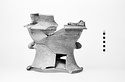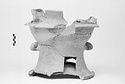 | Description: | Fragments missing from rim, walls and base. Deep brazier on high concave stand with slightly upturned rim. Two horizontal loop handles, doubled-over upward, at junction of brazier and base. Outward-turned rim with shallow grooves at edges. Three lugs, for holding pots, in the form of relief heads of bearded man. Hole in center of floor surrounded by two raised rings and three more holes. Rectangular door between floor and base of brazier. Coarse gritty grayish clay, unglazed. | |