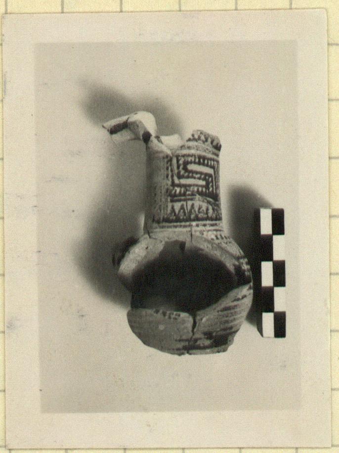 | Description: | Much mended and missing; restored in plaster. Small oinochoe with flat bottom, round body, straight neck and trefoil mouth. On lower body, narrow bands; at point of greatest circumference, checkerboard; on shoulder, zigzags; on neck, two maeander sections, each in a panel. | |