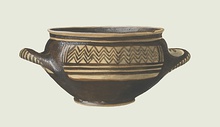 | Description: | Complete, save for slight chips from rim. Low cup; offset rim; horizontal handles. Quadruple zigzag panel on front and back; handles striped. Glazed all over, save underside of base and handles, parts reserved for pattern, stripes around lip and dot in center of inside. Pinkish-buff clay. Glossy brown glaze. | |