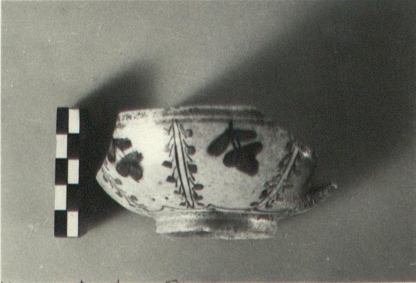 | Description: | Creamy glaze; flowers in red, yellow, green and blue, inside and out. Profile complete; boss in center. | |
