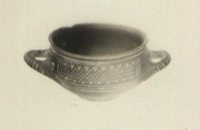 | Description: | Complete, save for slight chips from rim. Low cup; offset rim; horizontal handles. Quadruple zigzag panel on front and back; handles striped. Glazed all over, save underside of base and handles, parts reserved for pattern, stripes around lip and dot in center of inside. Pinkish-buff clay. Glossy brown glaze. | |